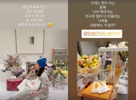 성유리는 3일 생일을 맞아 자신의 인스타그램을 통해 여러 장의 사진을 공개했다. 공개된 사진에는 팬들과 소속사 식구들이 보낸 꽃다발과 케이크, 선물 등으로 가득 채워져 있다.