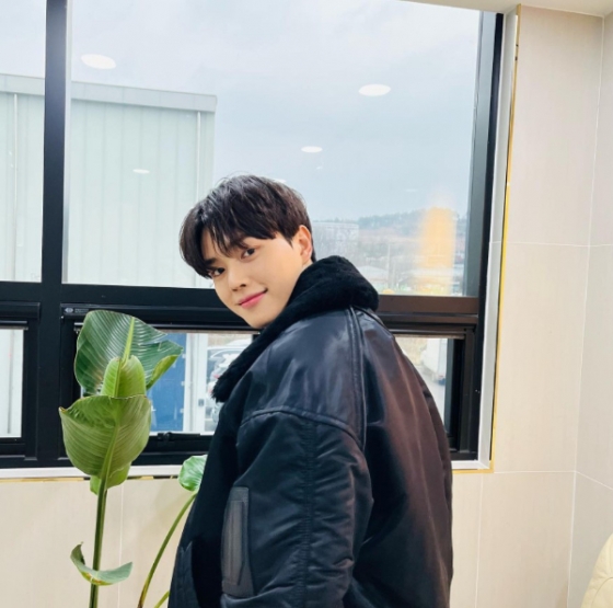 공개된 사진 속 송강은 가죽 재킷을 입고 미소를 띠고 있다.