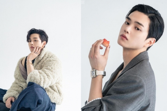 공개된 사진 속 송강은 화보 촬영장에서 카메라를 보고 포즈를 취하고 있다.