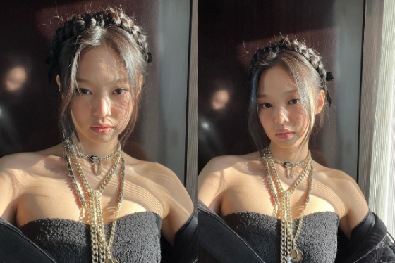8일 제니는 자신의 인스타그램을 통해 "Obsessed with this look"이라는 글과 함께 여러 장의 사진을 게재했다.