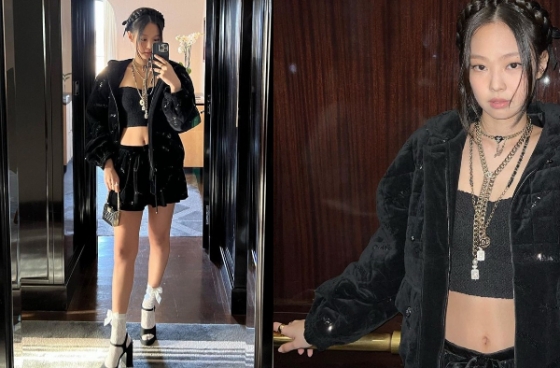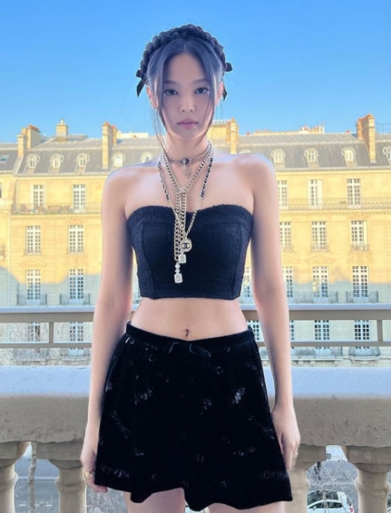 공개된 사진 속 제니는 검정 크롭톱과 미니스커트를 입고 샤넬 로고가 박힌 체인 액세서리를 찬 채 포즈를 취하고 있다. 2022/FW 파리 패션 위크에 참석한 듯 보인다. 제니의 땋아 올린 머리와 잘록한 허리가 눈길을 끈다.