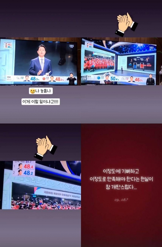 이날 배슬기는 인스타그램 스토리에 대선 개표방송을 시청하는 모습도 공개했다. 그는 윤석열 후보와 이재명 후보가 비슷한 득표율을 보이자 "나 눈물나 이게 이럴 일이냐고!"라는 글을 올렸다.
