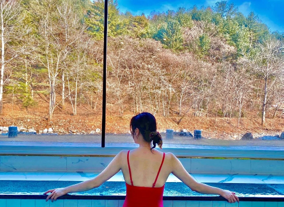 공개된 사진에서 고은아는 레드 컬러의 수영복을 입고 있다. 그는 수영복 뒤태와 함께 물 속에서 웃음을 참지 못하고 있다.