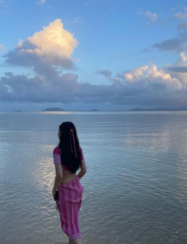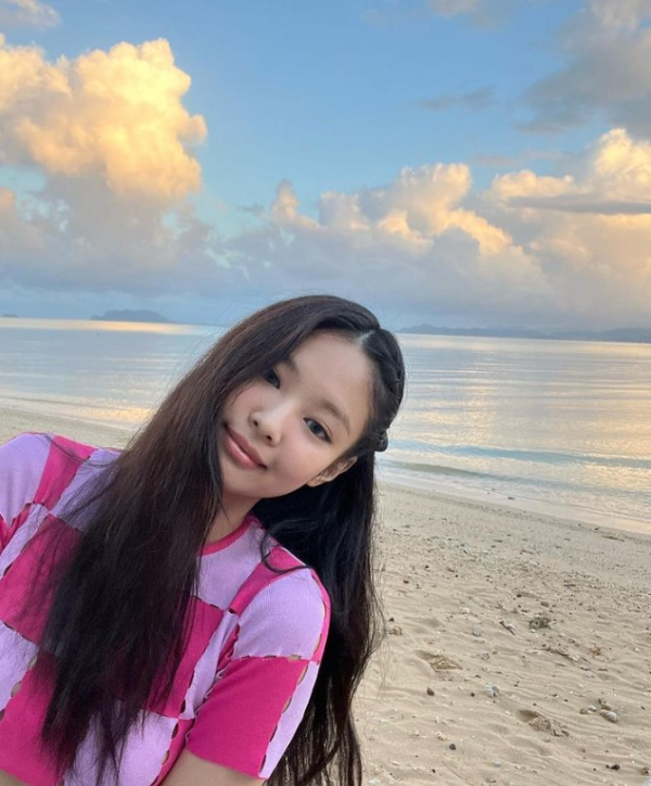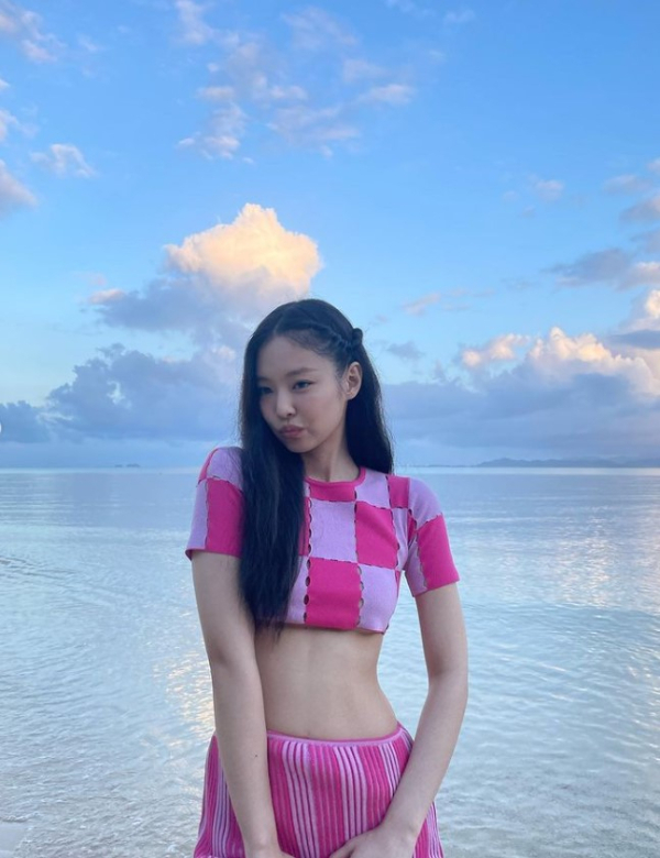 공개된 사진 속 제니는 긴 머리를 늘어뜨린 채 핑크 크롭톱과 롱스커트를 입고 포즈를 취하고 있다. 제니의 잘록한 허리와 넓게 펼쳐진 바다가 눈길을 끈다.