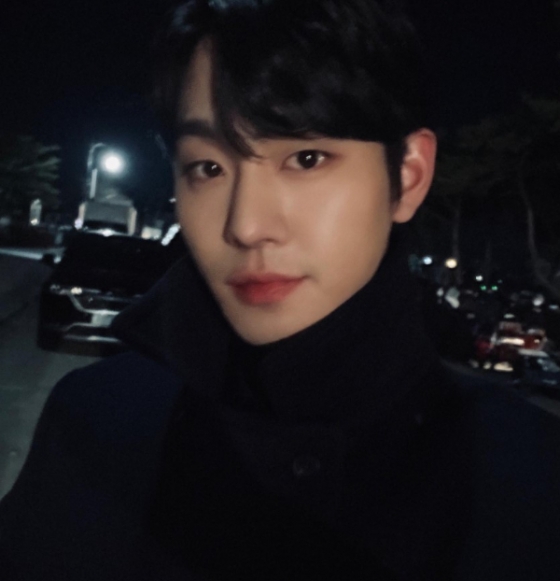 공개된 사진 속 안효섭은 한 밤중에 야외에서 검정 옷을 입고 셀카를 찍고 있다.