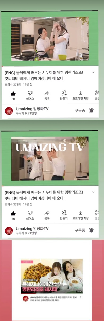 윤혜진은 13일 자신의 인스타그램 스토리에 시누이 엄정화의 유튜브 채널에 출연한 사진을 게재했다. 공개 된 사진에는'올케에게 배우는 시누이를 위한 명란리조또! 왓씨티비 혜지니 엄메이징티비 에 오다!'라는 제목이 적혀있다.