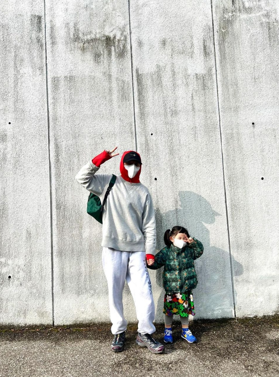 공개된 사진 속 봉태규는 모자와 선글라스, 마스크로 얼굴을 꽁꽁 사맨 채 카메라 앞에 서 있다. 또 다른 사진에는 딸 본비 양의 손을 잡고 함께 손가락으로 브이(V)를 그리고 있다.