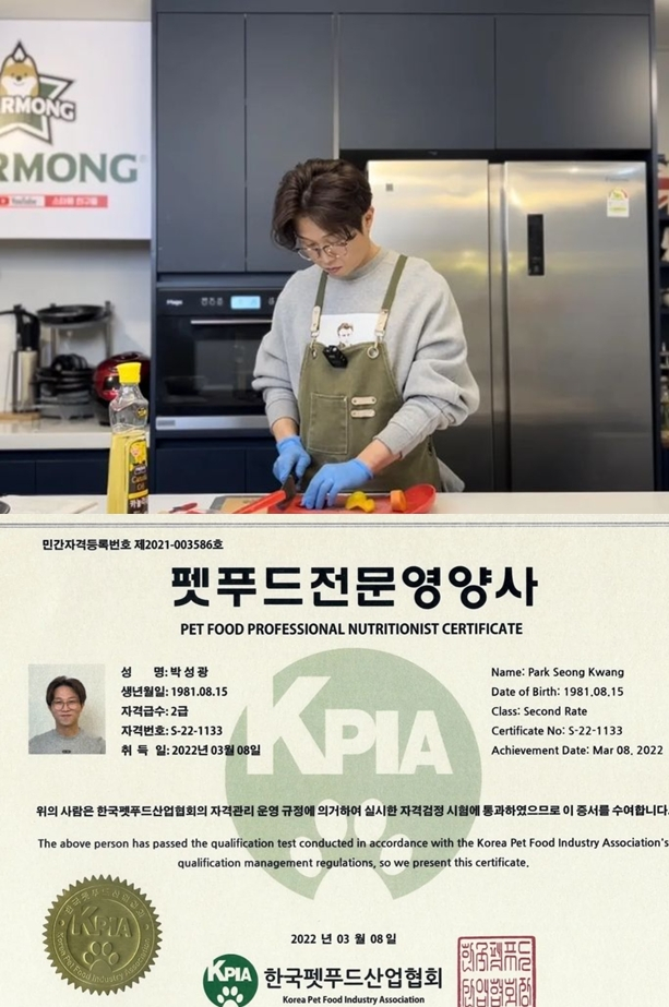 공개된 사진에는 펫푸드 전문 영양사 2급 자격 검정 시험 합격증이 담겨 있다. 또 다른 사진 속 박성광은 진지한 표정으로 요리에 임하고 있는 모습이다.