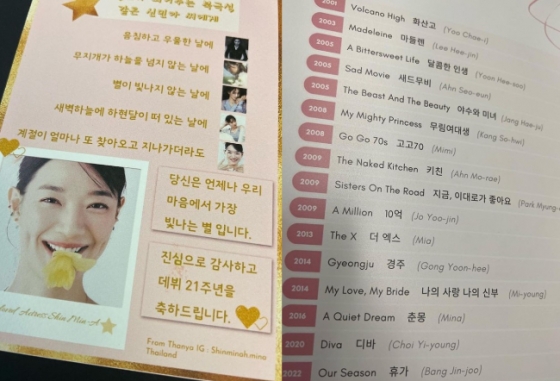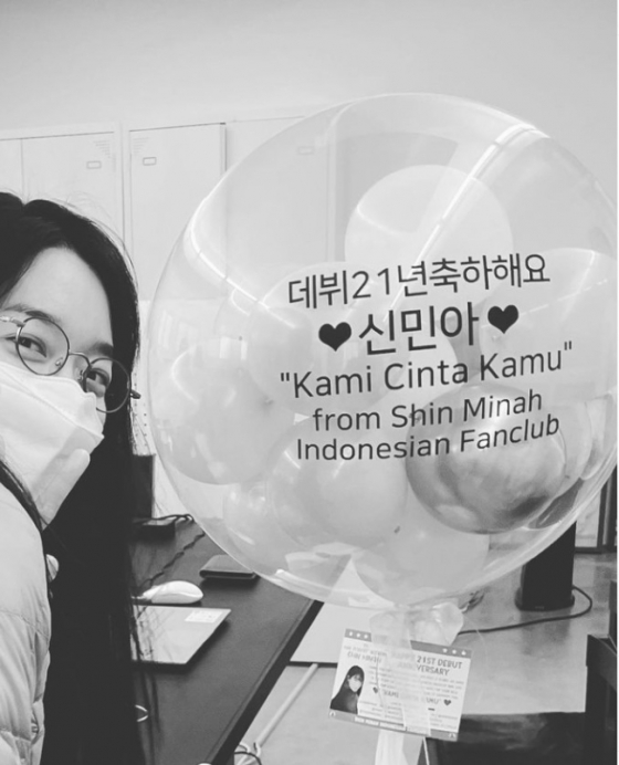 공개된 사진 속 신민아는 '데뷔 21주년 축하해요'라는 문구가 적힌 풍선을 들고 셀카를 찍고 있다. 다른 사진에는 데뷔 시절부터 현재까지 신민아의 모습이 담긴 앨범이 담겨있다. 또 앨범에는 신민아의 출연작 리스트도 빼곡히 쓰여있다.