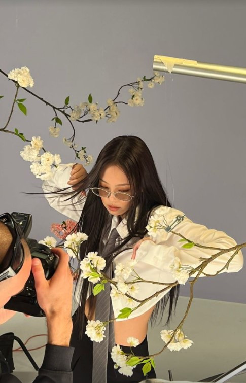공개된 사진 속 제니는 큐빅이 박힌 선글라스를 낀 채 흰색 셔츠에 넥타이를 매고 포즈를 취하고 있다. 꽃에 빨려 들어가는 듯한 제니의 그림 같은 화보가 시선을 사로잡는다. 또 해당 화보는 인스타 스토리를 통해 비하인드 컷이 공개됐다. 사진작가 앞에서 포즈를 취하는 제니의 잘록한 허리가 훤히 드러나 눈길을 끈다.