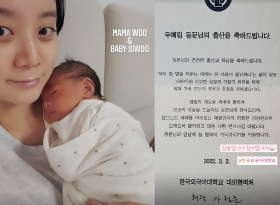 공개된 사진 속엔 혜림의 모교인 한국외대학교 대외협력처에서 "우혜림 동문 님의 출산을 축하드립니다. '아이 한 명을 키우는 데에는 온 마을이 필요하다'는 말이 있듯 '사랑이'의 건강한 성장과 가정의 화목을 위해 외대 가족 모두가 축복과 응원을 전하겠습니다"란 말을 보내왔다.