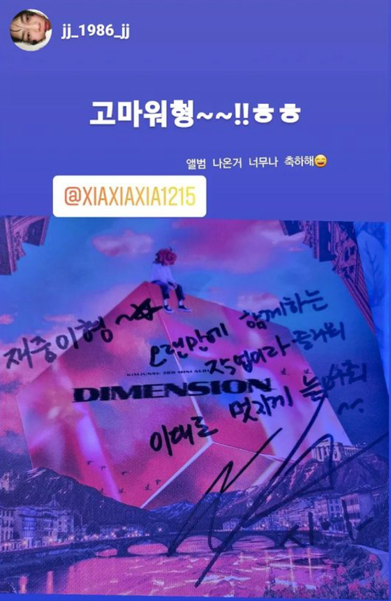 공개된 사진에는 김재중이 '앨범 나온 거 너무나 축하해'라는 글과 함께 김준수의 세 번째 미니앨범 'DIMENSION(디멘션)' 사진을 스토리에 올렸고 김준수는 이를 리스토리했다. 앨범에는 '재중이 형. 오랜만에 함께 하는 작업이라 즐거워. 이대로 멋지게 늙어줘'라고 김준수가 적힌 글이 담겨 있다.