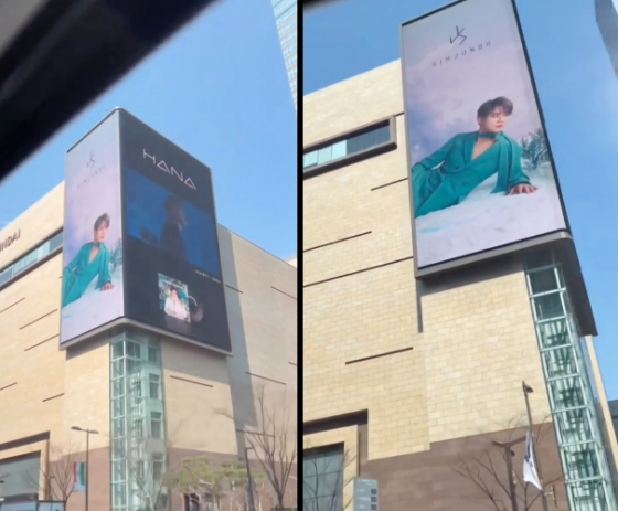 공개된 영상 속에는 현대 무역센터점 건물 전광판에 김준수의 새로운 앨범 'DIMENSION(디멘션)'의 타이틀 곡 'HANA(하나)' 뮤직비디오가 흘러나오고 있다.