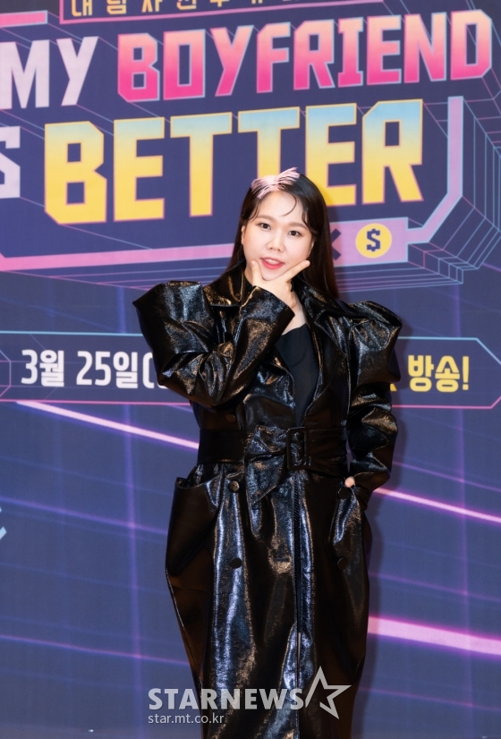 코미디언 홍현희가 25일 오후 온라인 생중계로 진행된 엠넷 새 예능 'MY BOYFRIEND IS BETTER' 제작발표회에 참석해 포즈를 취하고 있다.