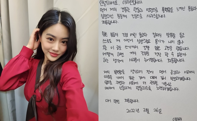 논란이 커지자 이하린은 문제의 게시물을 삭제하고 26일 자필 사과문을 게재했다. 이하린은 "저의 경솔한 행동과 언행으로 불편함을 느끼신 분들과 실망하신 분들께 진심으로 사과 드린다"고 사과했다.