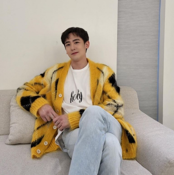 사진 속 닉쿤은 옐로우 컬러 가디건을 입고 포즈를 취하고 있다.