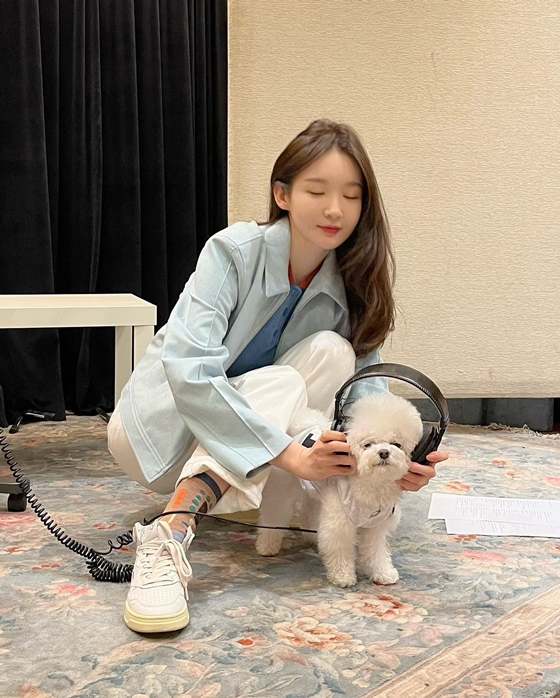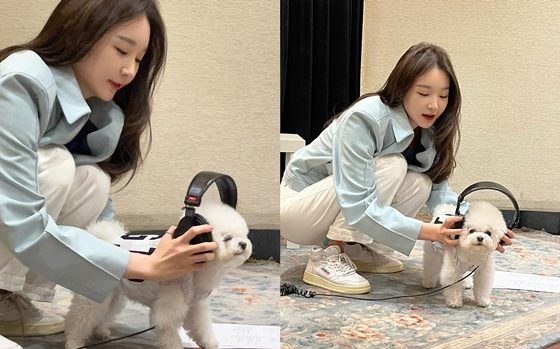 공개된 사진에는 강민경이 반려견에 헤드셋을 씌워주고 있다. 강민경과 반려견은 귀여운 표정으로 시선을 끈다.
