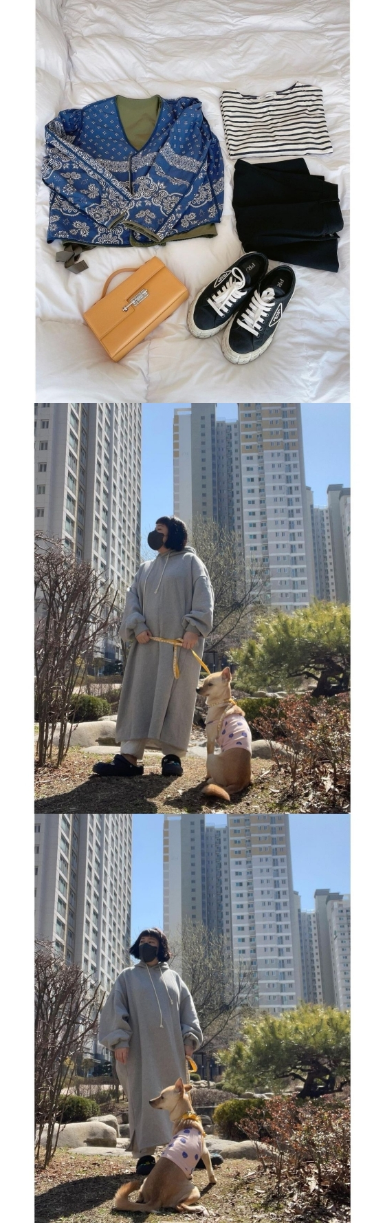 김영희는 28일 오후 자신의 인스타그램을 통해 "#오늘의착장 #ootd 날씨가 너무 좋아서 황금이랑 애견카페 데이트. 상의 하의 나눠입기 귀찮아서 한 번에 입고 벗기 쉬운 옷으로..오늘은 힐튼이 아버지 크록스 신고 카페는 무슨..아파트 단지 돌기 #예비맘의하루"라는 글과 함께 여러 장의 사진을 게재했다.