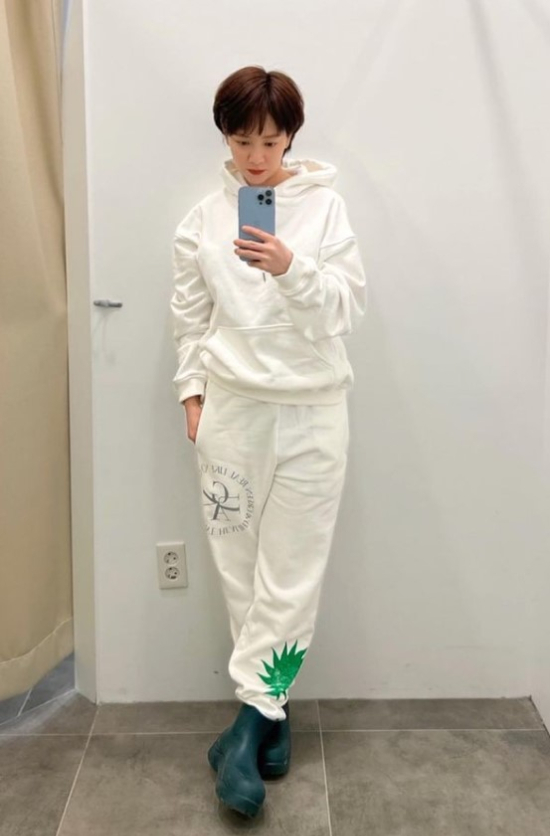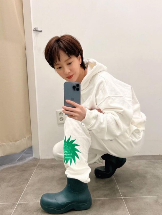 공개된 사진 속 송지효는 과감한 숏컷을 한 채 흰색 트레이닝복에 통굽 부츠를 신고 거울 셀카를 찍고 있다. 송지효의 복장과 힙한 포즈가 눈길을 끈다.