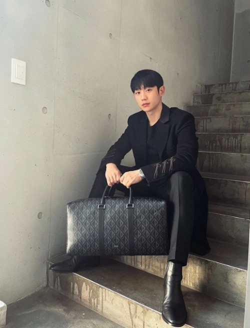 공개된 사진 속 정해인은 검정 수트와 부츠를 신고 계단에 앉아 포즈를 취하고 있다. 정해인의 작은 얼굴과 완벽한 비율이 눈길을 끈다.