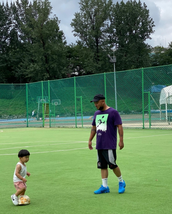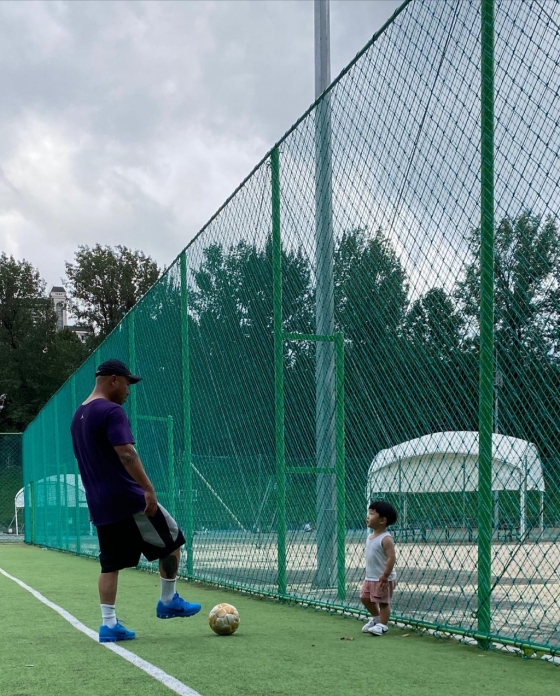 공개된 사진에서 길은 아들 하음 군과 야외 축구장에서 공놀이를 하는 모습.