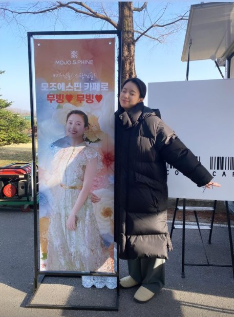 공개된 사진 속 한효주는 검정 패딩을 입고 자신의 얼굴이 박힌 배너 옆에서 눈을 감고 팔을 벌리고 있다. 한효주의 슬며시 지은 귀여운 미소가 눈길을 끈다.