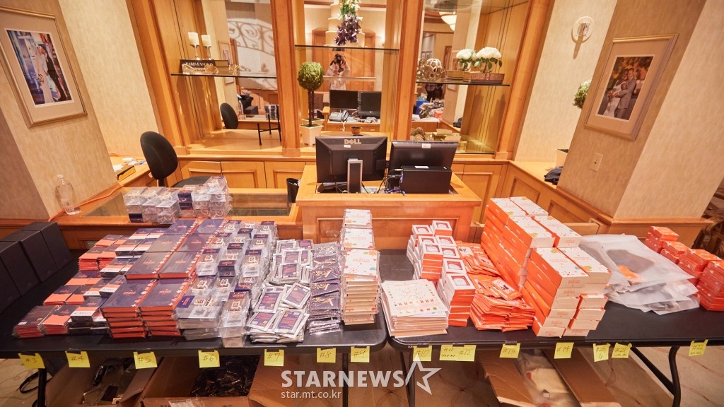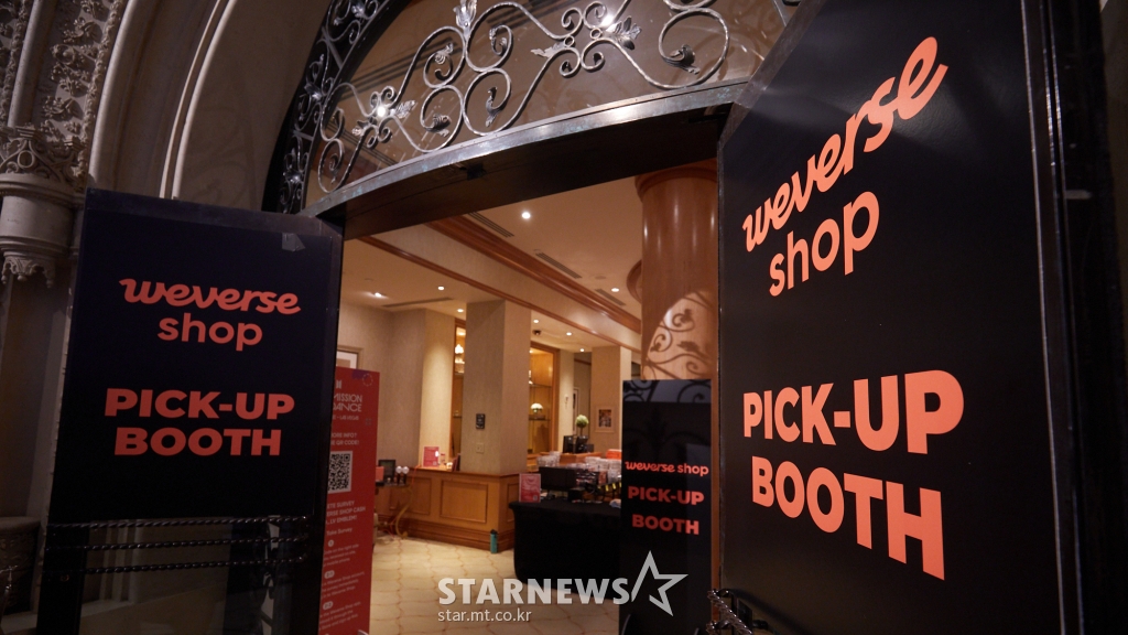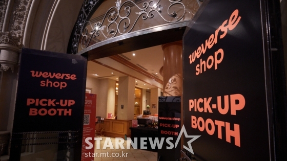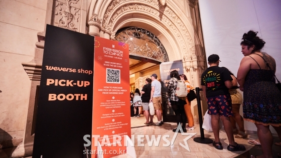 방탄소년단의 콘서트 '퍼미션 투 댄스 온 스테이지'가 열리는 라스베이거스에서 온라인으로 주문한 상품을 수령할 수 있는 위버스샾 부스가 운영되고 있다.