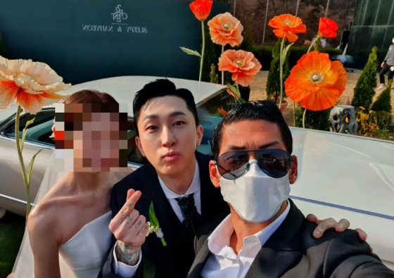 사진 속엔 이날 결혼한 슬리피 부부가 박준형과 함께 포즈를 취하고 있다. 특히 정식으로 새 신랑이 된 박준형의 밝은 모습이 돋보인다.