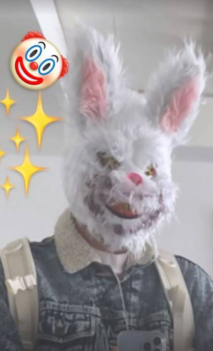 그는 익살맞게 웃는 토끼 탈을 쓴 모습으로 장난기를 발산했다.
