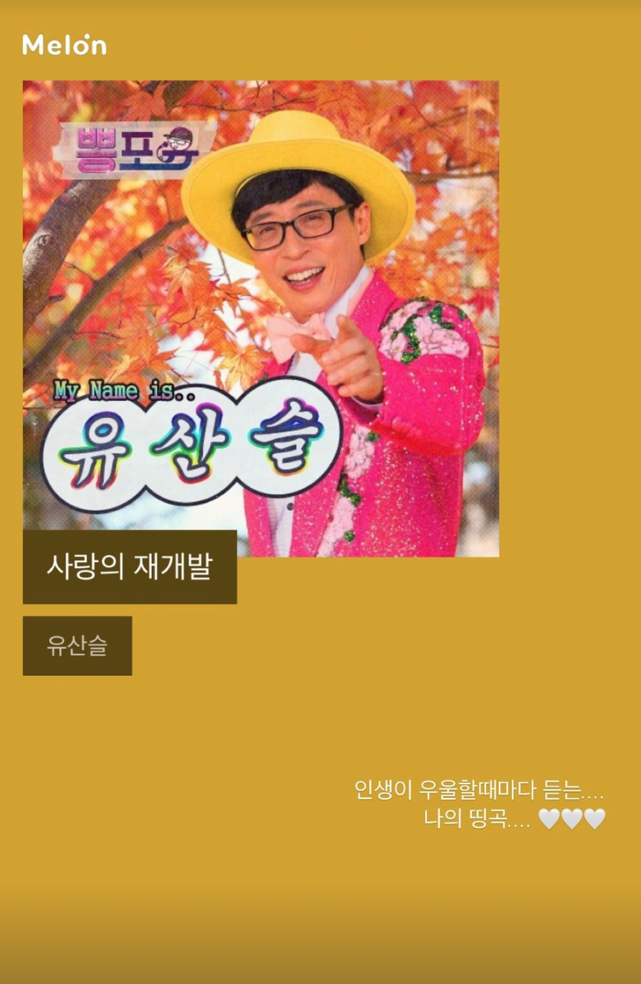 최준희는 자신의 플레이리스트로 유재석이 MBC '놀면 뭐하니'에서 부캐릭터로 소화한 유산슬의 '사랑의 재개발'을 스트리밍하고 있음을 인증하며 "인생이 우울할 때마다 듣는 나의 띵곡"이라고 적었다.