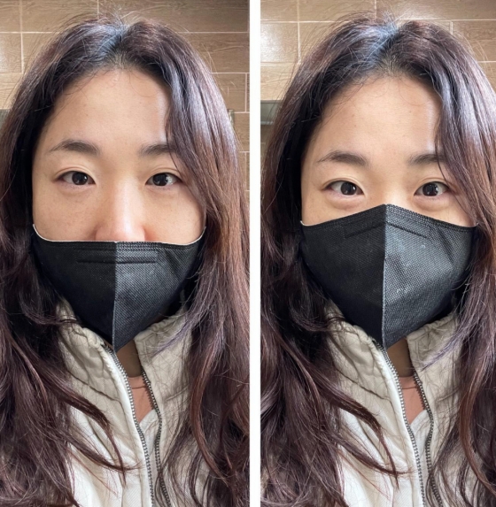 사진에서 이미도는 마스크를 쓰면서 다른 위치에 놓고 사진을 찍으며 비교하고 있다.