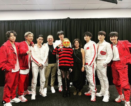 공개된 사진에는 방탄소년단과 함께 인증샷을 남기고 있는 사이먼 페그 가족의 모습이 담겨있다. '영국 아미'로 알려진 사이먼 페그를 비롯해 그의 가족들은 행복한 미소로 이번 만남을 즐겼다.