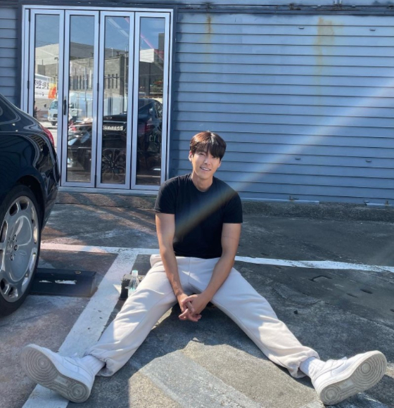 공개된 사진 속 김우빈은 검정 반팔티에 흰색 바지를 입고 주차장에 앉아 웃고 있다. 앉아있어도 드러나는 김우빈의 기럭지가 눈길을 끈다.