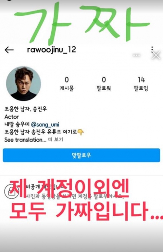 배우 송진우가 sNS 사칭 계정에 주의해 달라고 전했다.