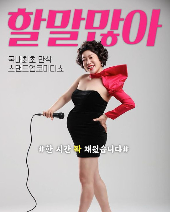 공개된 사진 속 김영희는 딱 달라붙는 원피스를 입고 포즈를 취하고 있다. 포스터엔 "할말 많아. 국내 최초 만삭 스탠드업 코미디쇼. 한 시간 꽉 채웠습니다"라며 웃음 폭탄을 예고했다.