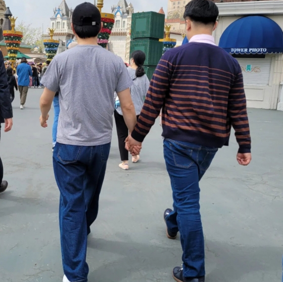 손을 잡고 있는 오정세와 배범준 씨는 다정하게 놀이공원을 다니며 즐거운 모습을 보이고 있다.