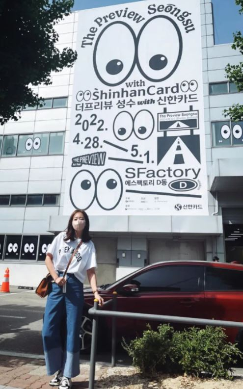사진에서 소유진은 성수동에서 열린 아트페어를 방문했음을 인증했다. 소유진은 오버핏 티셔츠와 청바지를 입고 동안 미모를 과시하고 있다.