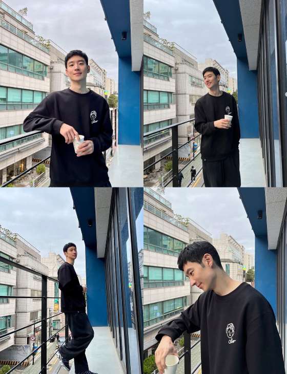 공개된 사진 속 이제훈은 검정 티에 펑퍼짐한 바지를 입고 테라스에서 포즈를 취하고 있다. 종이컵 하나를 든 이제훈의 모습에도 화보를 연상케 한다.