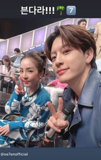 공개된 사진 속에는 산다라박이 세븐과 함께 MBC 예능 '복면가왕' 촬영장에 있는 모습이 담겨 있었다. 두 사람은 브이자 포즈를 취하며 훈훈한 비주얼합을 과시했다.