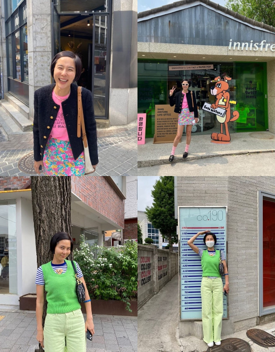 공개된 사진 속 김나영은 화려한 꽃무늬 스커트에 핑크 티, 양말을 신고 해맑게 웃고 있다. 다른 사진에는 선글라스를 끼고 브이를 한 채 포즈를 취하고 있다. 또 민트 바지에 조끼를 입고 웃으며 카메라를 쳐다보고 있다.