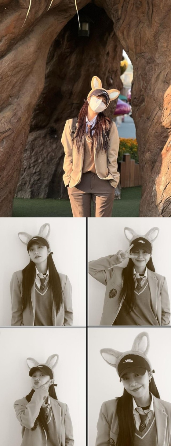 공개된 사진 속 정은지는 놀이공원에서 베이지색 교복에 동물 귀 모양 머리띠를 한 채 포즈를 취하고 있다. 다른 사진에는 정은지가 인생 네 컷을 찍으며 시크한 표정. 브이한 표정 등 러블리한 매력으로 시선을 사로잡았다.