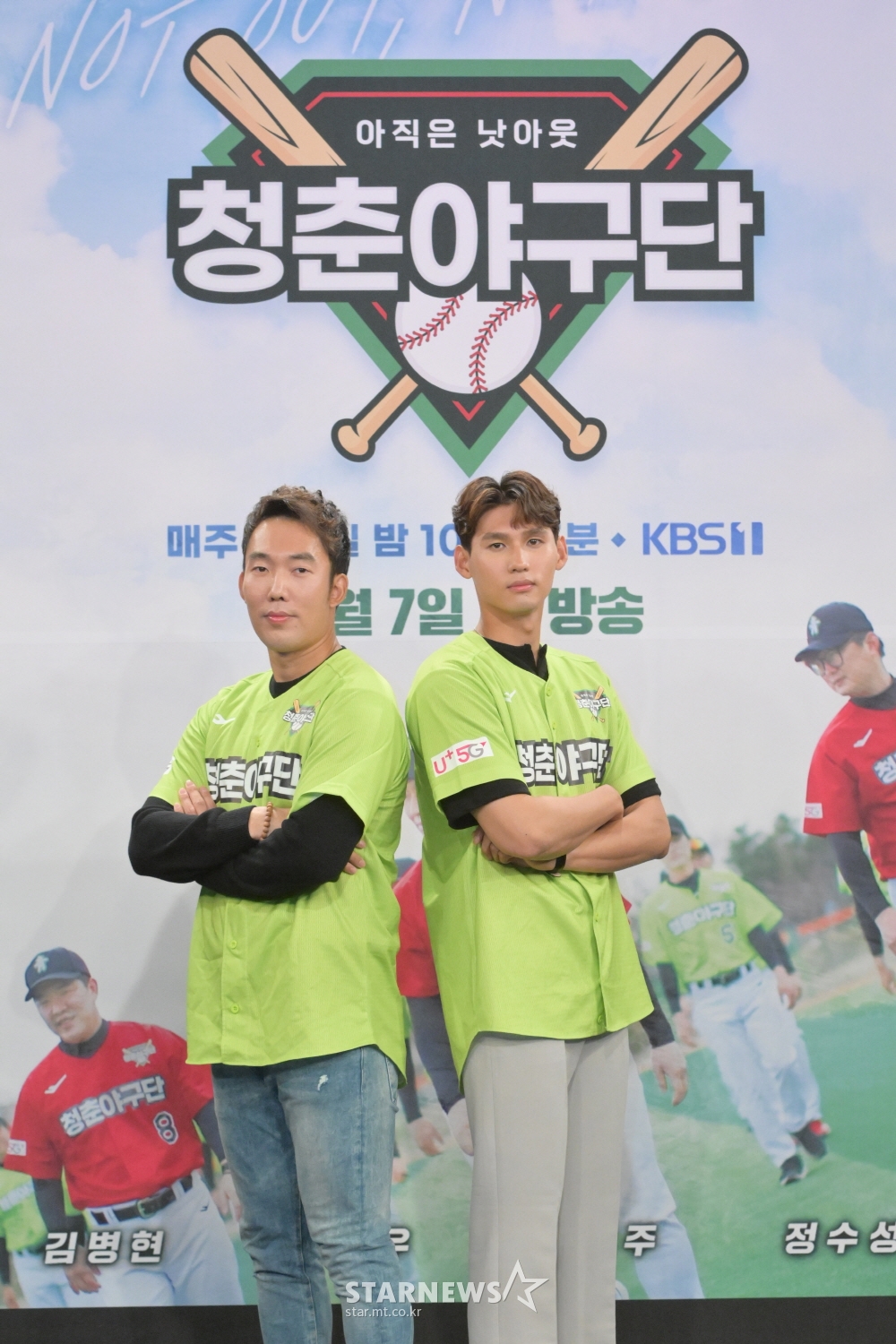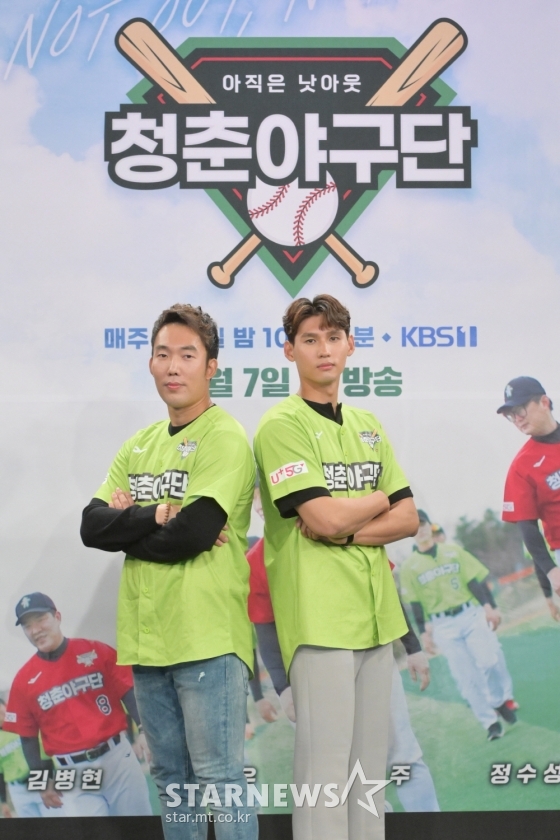 금유성, 전태준 선수가 6일 오전 온라인 생중계로 진행된 KBS 1TV 새 예능 '청춘야구단: 아직은 낫아웃' 제작발표회에 참석해 포즈를 취하고 있다.