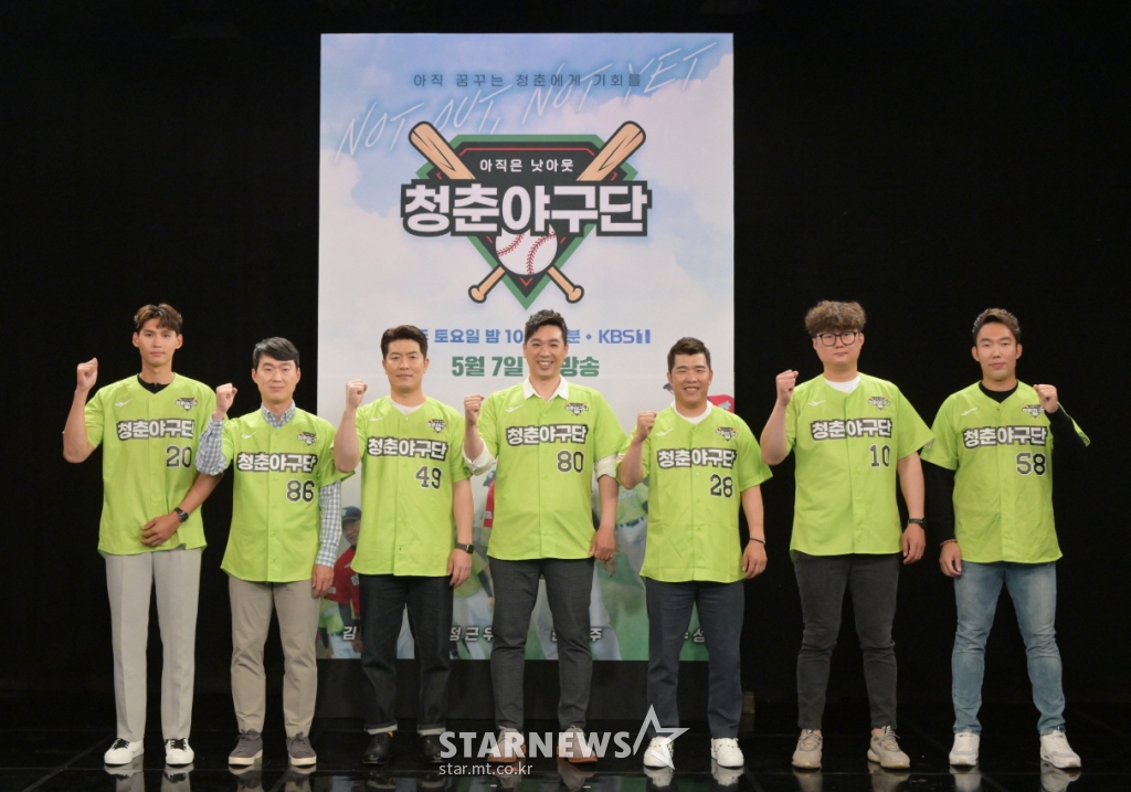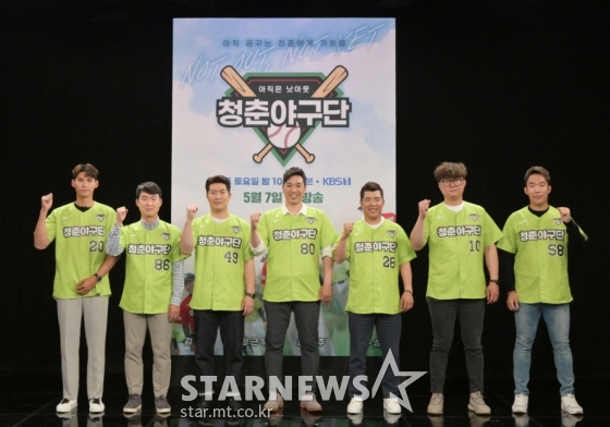 김병현, 정근우, 한기주, 정수성, 금유성, 전태준, 손성권 PD가 6일 오전 온라인 생중계로 진행된 KBS 1TV 새 예능 '청춘야구단: 아직은 낫아웃' 제작발표회에 참석해 포즈를 취하고 있다.