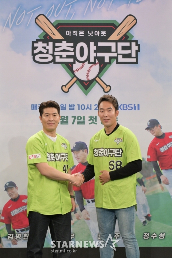 김병현 감독, 금유성 선수가 6일 오전 온라인 생중계로 진행된 KBS 1TV 새 예능 '청춘야구단: 아직은 낫아웃' 제작발표회에 참석해 포즈를 취하고 있다.