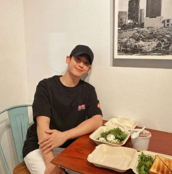 공개된 사진 속 정해인은 샐러드가 담긴 식탁에 앉아 검정 캡모자에 반팔티를 입고 미소 짓고 있다.