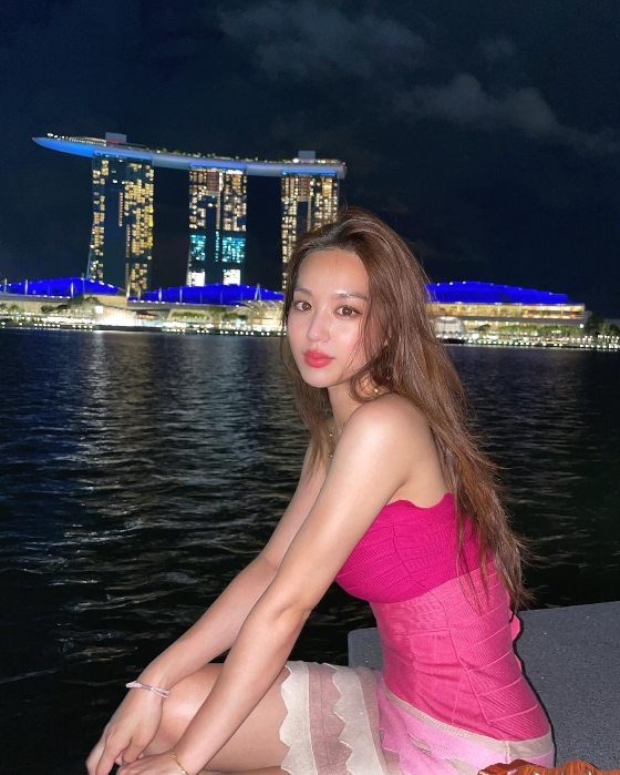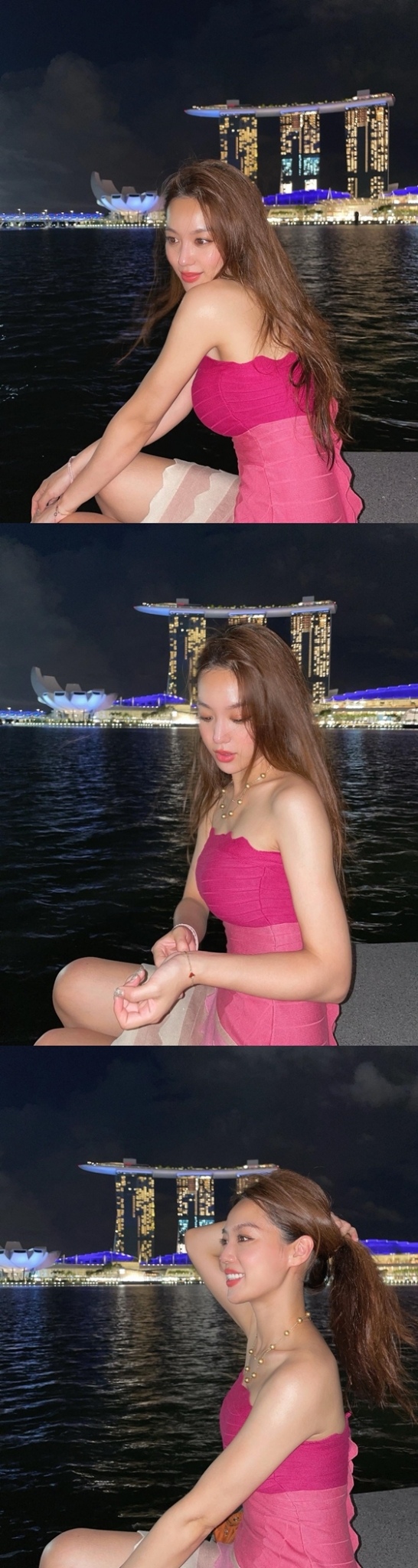 공개된 사진에는 싱가포르의 명소 중 하나로 손꼽히는 마리나 베이 샌즈를 배경으로 기념 사진을 촬영한 김희정의 모습이 담겼다.