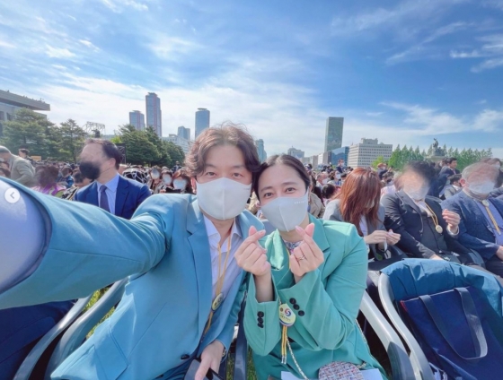 공개된 사진 속 최송현은 지난 10일 진행된 제20대 윤석열 대통령 취임식에 참석한 모습이다. 그는 취임식이 열린 서울 여의도 국회의사당 앞 잔디마당에서 남편 이재한과 함께 손가락으로 하트를 그리며 훈훈한 분위기를 자아내고 있다. 이어 "정장 다시 입을 수 있게 다이어트가 성공적으로 이루어지고 있다. 이제 살찌지 말자. 정장 커플 보기 좋으네"라며 남편과 함께 입은 의상을 자랑하기도 했다.