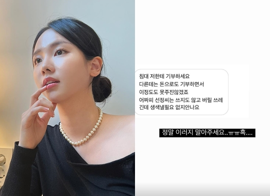 공개된 사진에는 한 누리꾼이 최선정에게 보낸 DM이 담겨있다. 해당 누리꾼은 "침대 저한테 기부하세요. 다른데는 돈으로도 기부하면서 이정도도 못주진 않겠죠. 어차피 선정 씨는 쓰지도 않고 버릴 쓰레긴데 생색낼 필요 없지 않나요"라고 요구했다.