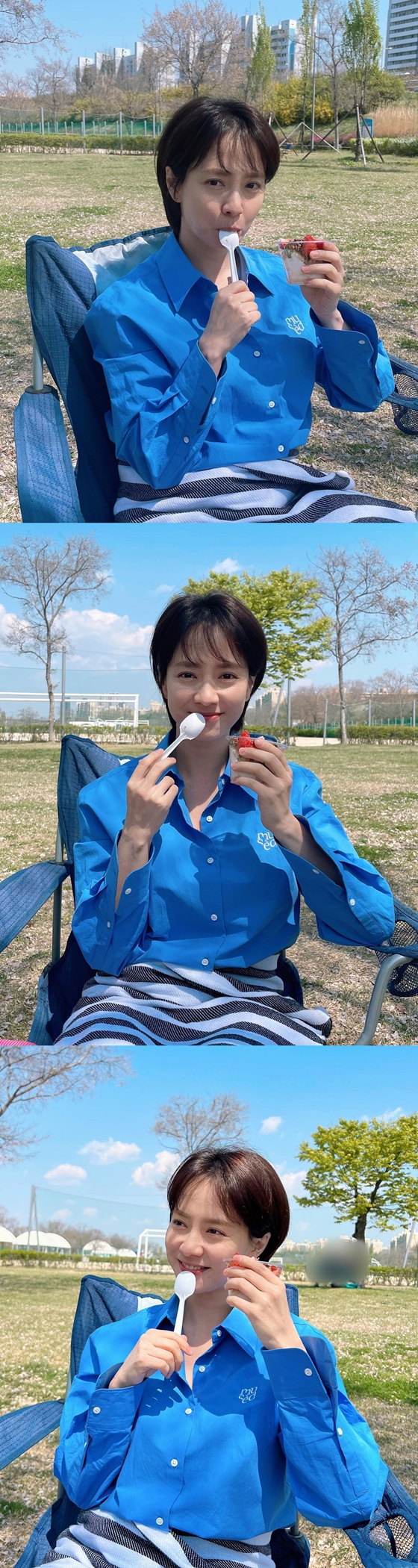 공개된 사진에는 파란색 셔츠를 입은 송지효의 모습이 담겼다. 송지효는 손에 숟가락, 디저트를 들고 있다. 뚜렷한 이목구비에 상큼함 가득한 미소는 햇살보다 더 눈부신 미모를 완성케 했다.