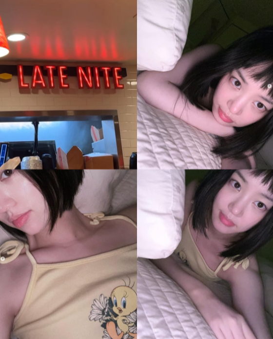 공개된 사진 속 이유비는 애니메이션 캐릭터가 그려진 노랑 끈나시를 입은 채 침대에 누워 포즈를 취하고 있다. 이유비의 더욱 짧아진 머리칼이 한껏 귀여움을 강조한다. 또 잡티 하나 없는 말끔한 피부와 커다란 눈이 시선을 끈다.